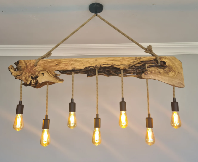 live Wood Rustic Light Fixture, Farmhouse Wooden Live Edge Chandelier For Dining Room, Unique Ceiling Light For Dining Table and Kitchen
