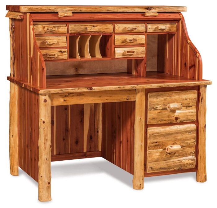 You get to choose the wood type (Aspen, Plain Pine, Red Cedar, or Rustic Pine) and finish (Clear-Coat Varnish with Stain, Clear-Coat without Stain, or Unfinished) so your desk fits exactly with your existing wood tones and rustic décor scheme. The rolltop design adds a layer of versatility and charm — roll it closed to tidy up the workspace or roll it open when inspiration strikes. The single pedestal style gives it a strong presence without overwhelming the space. It’s ideal for log homes, cabins, lodges, or any space where natural wood and rugged beauty take center stage.